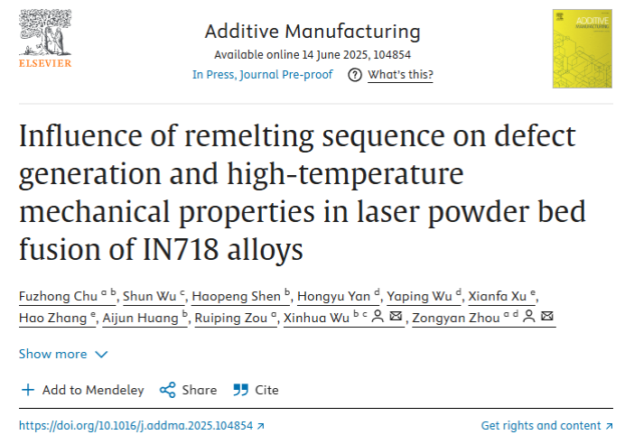 该研究形成研究成果“Influence of remelting sequence on defect generation and high-temperature mechanical properties in laser powder bed fusion of IN718 alloys”发表在国际增材制造顶刊Additive Manufacturing上。